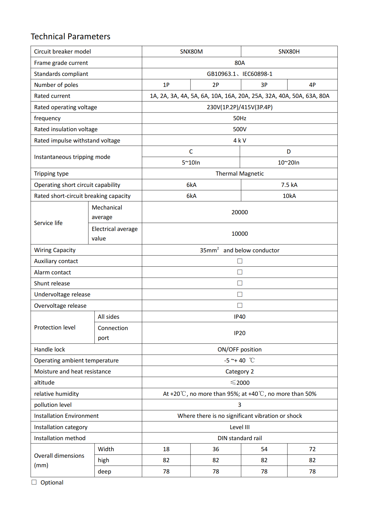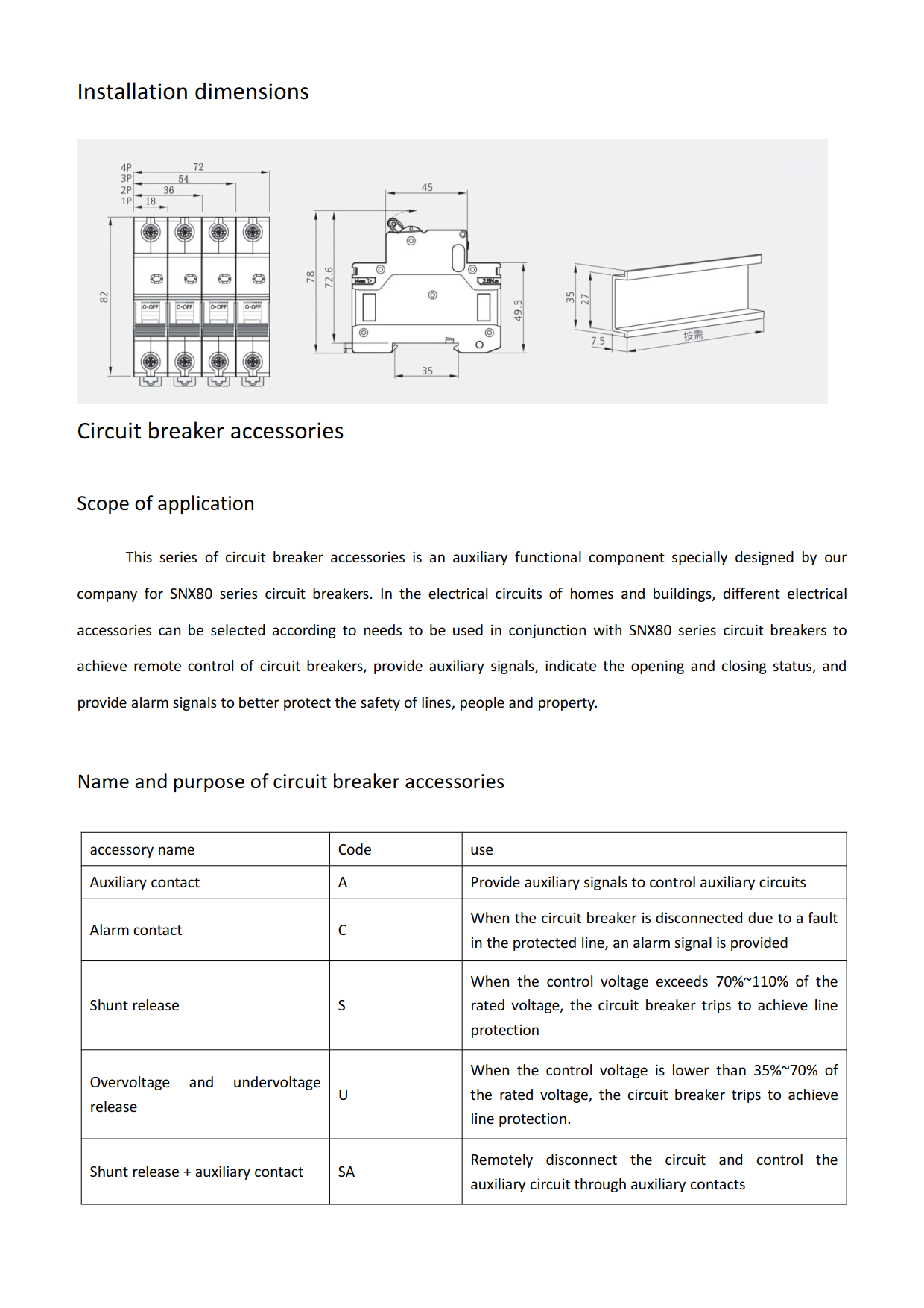 SNX80 series miniature circuit breakers are suitable for overload and short circuit protection of AC 50/60Hz rated voltage 230/4 15 V, rated current up to 80A lines, and can also be used for infrequent line operation conversion under normal circumstances. Miniature circuit breakers are mainly used in various places such as industry, commerce, high-rise and residential buildings.