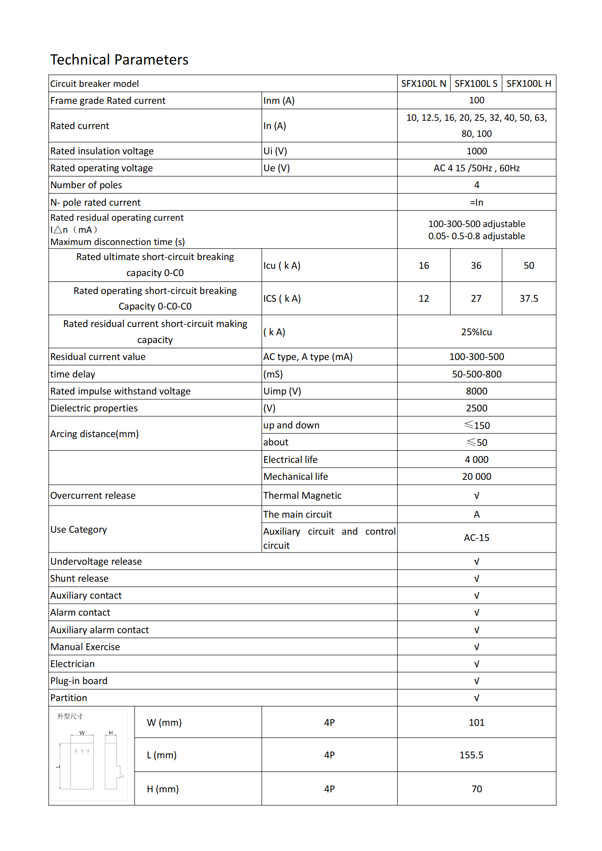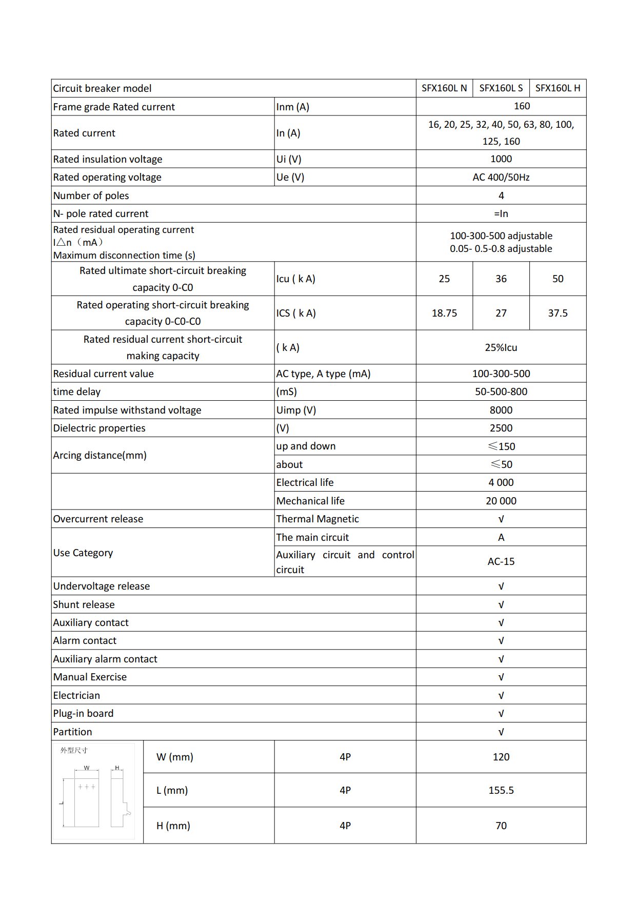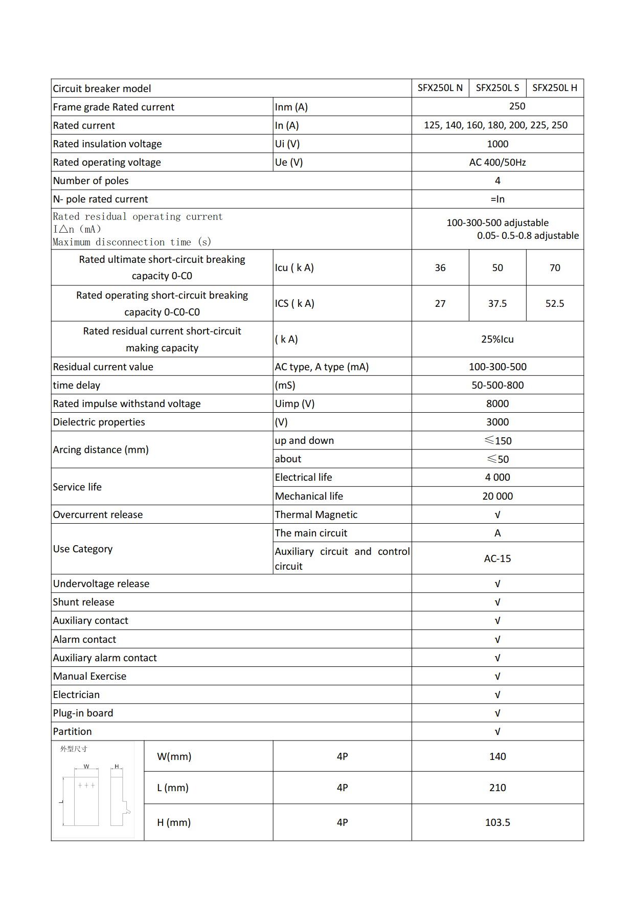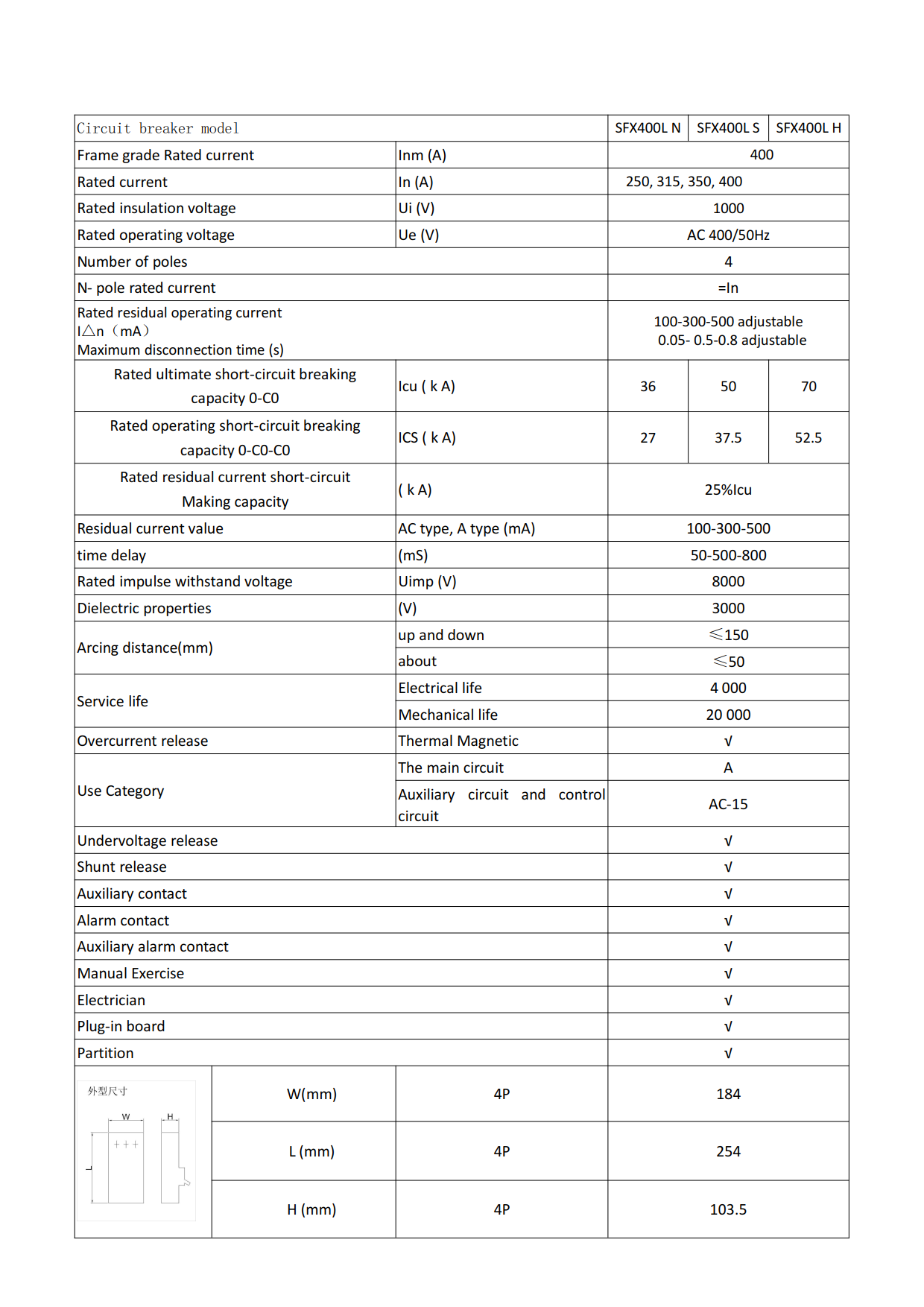 SFX series Residual current operated Circiut-breakers(hereinafter referred to as circuit breakers), SFX series earth leakage circuit breaker (hereinafter referred to as circuit breaker) has a rated insulation voltage of 1000V and is suitable for infrequent conversion and infrequent starting of motor in the circuit with AC 50HZ/60HZ, rated working voltage of 400V and rated working current of 400A. The circuit breaker has overload, short-circuit, under-voltage and residual current protection functions, which can protect the line and power supply equipment from harm, and the circuit breaker has isolation function.